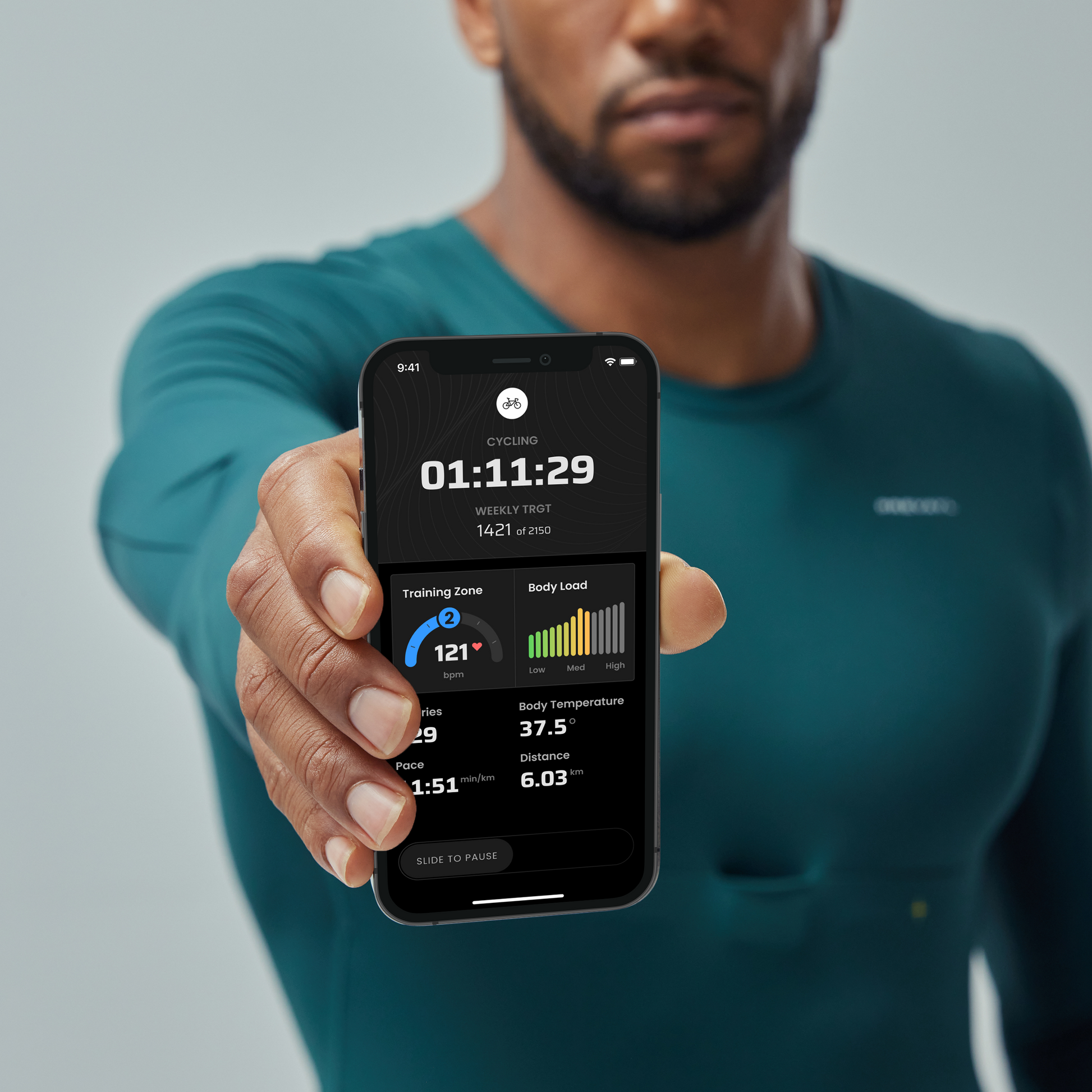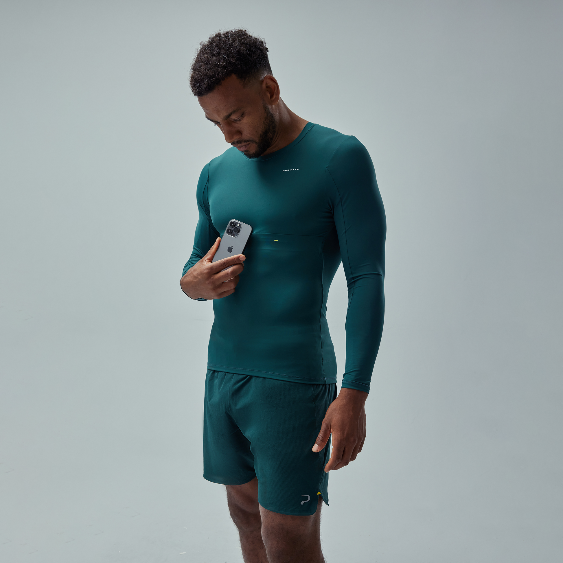 A second-skin fit long sleeve t-shirt with integrated smart technology and a discreet pocket to hold the Prevayl Sensor close to your chest for optimal biometric reading.